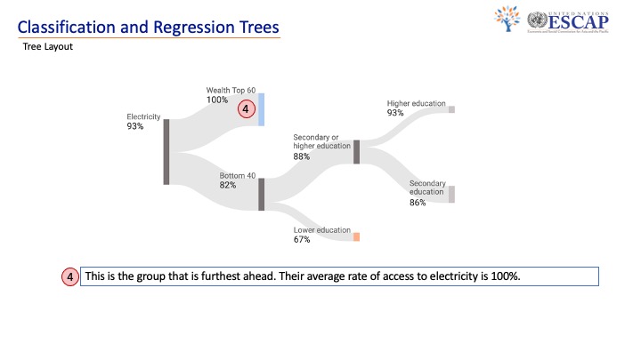 Our light blue nodes are our furthest ahead node. This node has an average access to electricity of 100%. Which means that this LNOB tree is showing us that 100% of people in the top 60 percent of household wealth has access to electricity.