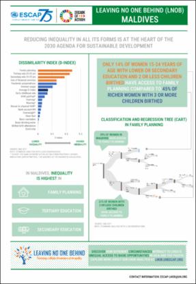 Leaving No One Behind (LNOB) tool helps discover how different circumstances interact to create unequal access to basic opportunities in Asia and the Pacific. The LNOB country brief for Maldives provides insights into which groups are further ahead and further behind in various SDG indicators and where the biggest gaps are found in terms of access to opportunities or prevalence of barriers between the furthest behind and the furthest ahead groups in Maldives.