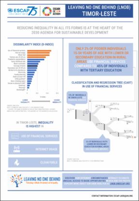 Leaving No One Behind (LNOB) tool helps discover how different circumstances interact to create unequal access to basic opportunities in Asia and the Pacific. The LNOB country brief for Timor-Leste provides insights into which groups are further ahead and further behind in various SDG indicators and where the biggest gaps are found in terms of access to opportunities or prevalence of barriers between the furthest behind and the furthest ahead groups in Timor-Leste.