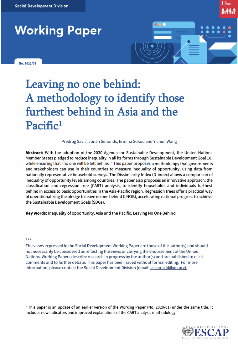With the adoption of the 2030 Agenda for Sustainable Development, the United Nations Member States pledged to reduce inequality in all its forms through Sustainable Development Goal 10, while ensuring that “no one will be left behind.” This paper proposes a methodology that governments and stakeholders can use in their countries to measure inequality of opportunity, using data from nationally representative household surveys. The Dissimilarity Index (D-index) allows a comparison of inequality of opportunity levels among countries. The paper also proposes an innovative approach, the classification and regression tree (CART) analysis, to identify households and individuals furthest behind in access to basic opportunities in the Asia-Pacific region. Regression trees offer a practical way of operationalizing the pledge to leave no one behind (LNOB), accelerating national progress to achieve the Sustainable Development Goals (SDGs).