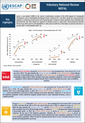 Leave no one behind (LNOB) is the central, transformative promise of the 2030 Agenda for Sustainable Development and its Sustainable Development Goals. This Voluntary National Review brief provides a snapshot on SDG progress in Nepal. Between 2011 and 2022, significant progress has been recorded in access to basic sanitation, basic drinking water and electricity.