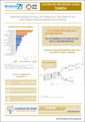 Leaving No One Behind (LNOB) tool helps discover how different circumstances interact to create unequal access to basic opportunities in Asia and the Pacific. The LNOB country brief for Samoa provides insights into which groups are further ahead and further behind in various SDG indicators and where the biggest gaps are found in terms of access to opportunities or prevalence of barriers between the furthest behind and the furthest ahead groups in Samoa.