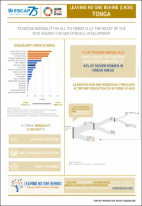 Leaving No One Behind (LNOB) tool helps discover how different circumstances interact to create unequal access to basic opportunities in Asia and the Pacific. The LNOB country brief for Tonga provides insights into which groups are further ahead and further behind in various SDG indicators and where the biggest gaps are found in terms of access to opportunities or prevalence of barriers between the furthest behind and the furthest ahead groups in Tonga.